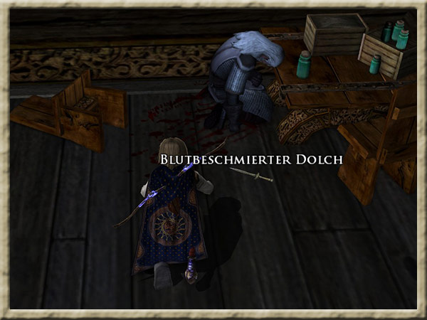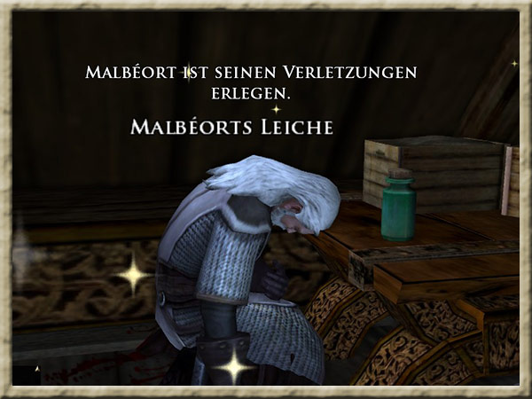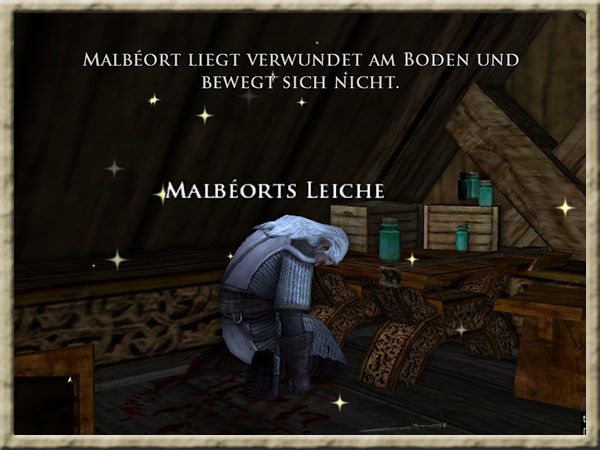 Malbéort Heim befindet sich am hinteren Ende des Marktbereichs der Stadt des Waldmeisters, westlich des Brunnens. Malbéort Heim sollte nach Hinweisen auf eine Mordwaffe untersucht werden. |
