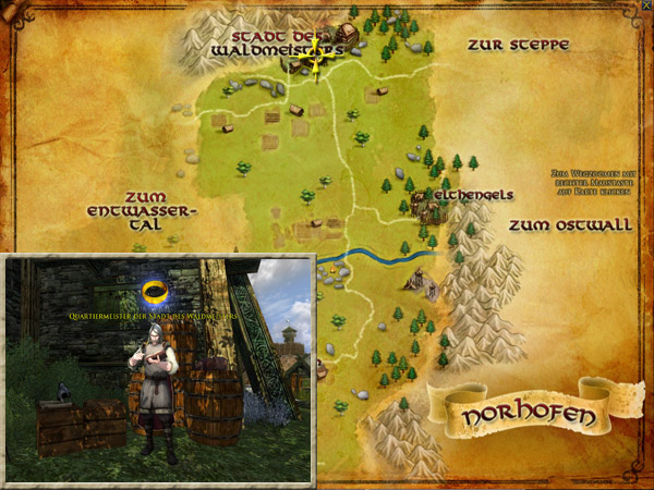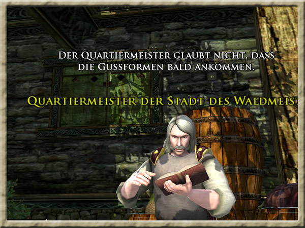 Der Quartiermeister der Stadt des Waldmeisters befindet sich südlich des Brunnens, Trumsele hat Euch gebeten, beim Quartiermeister anzufragen, wann die Gussformen ankommen werden, |