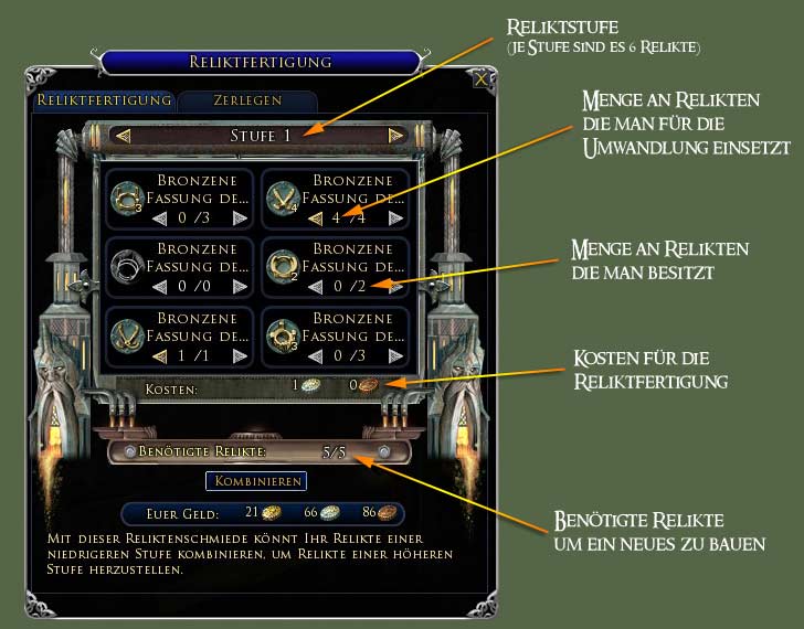In der Stufe 1 benötigt man z.B. 5 Relikte um daraus ein neues zu fertigen. |