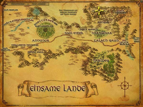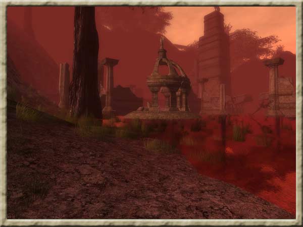 Nördlich der Großen Oststraße, wo sie von der Einöde der Einsamen Lande zur Letzten Brücke führt, nördlich auch von den Ruinen der Feste Guruth, Heimat der plündernden Eglain, liegt eine weite Moorlandschaft, die unter dem Namen Rotsümpfe bekannt ist. Der Sumpf hat nicht immer so ausgesehen. Einst war er ein kleiner See neben einer grünen Wiese, aber Geschichten erzählen davon, dass ein großer, blutiger Kampf zwischen den Bergmenschen von Rhudaur und den Armeen von Arthedain und Cardolan hier an dieser Stelle stattfand. Das Blut der Gefallenen verdarb das Wasser des Sees, verunreinigte ihn und das Land drum herum. |