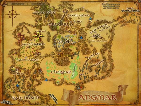 In Der Herr der Ringe Online: Die Schatten von Angmar sind die Bergmenschen von Angmar Nachfahren der Bergmenschen von Rhudaur, die dem Hexenkönig dienten und von Eärnur, dem Prinzen von Gondor, besiegt und sprichwörtlich ausgelöscht wurden. Viele lösten sich zwar nach Angmars Niederlage aus der Knechtschaft, aber die neue Macht in Carn Dûm brachte sie schnell wieder unter die Knute. |