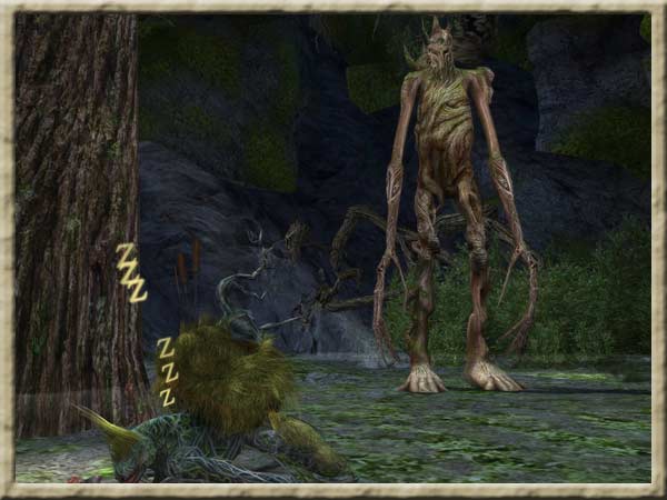 Beim Entwickeln des Evendim-Gebietes und zur Erschaffung der Traufenspitze bezogen die Entwickler von Turbine ihre Quellen aus Baumbarts Erzählung in Der Herr der Ringe, demzufolge sich die Ents außerhalb der Landesgrenzen auf die Suche nach den Entfrauen machten. Spieler, die einen ersten Blick auf einen leibhaftigen Ent werfen möchten, werden die schattigen Wälder von Evendim aufsuchen wollen, doch es ist eine schwierige Aufgabe: Gauradain und Riesen sind nicht die einzigen Gefahren, die im Traufenspitz lauern … Waldtrolle haben ebenfalls ihren Weg in diese Gefilde gefunden. |