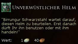 Birrunger Schwarzstahl hält sich in Thorenhad auf, dem Lager der Söhne Elronds in den Trollhöhen. Birrunger Schwarzstahl wartet darauf, dass Ihr einen unverwüstlichen Helm anfertigt, damit er dessen Güte beurteilen kann. |